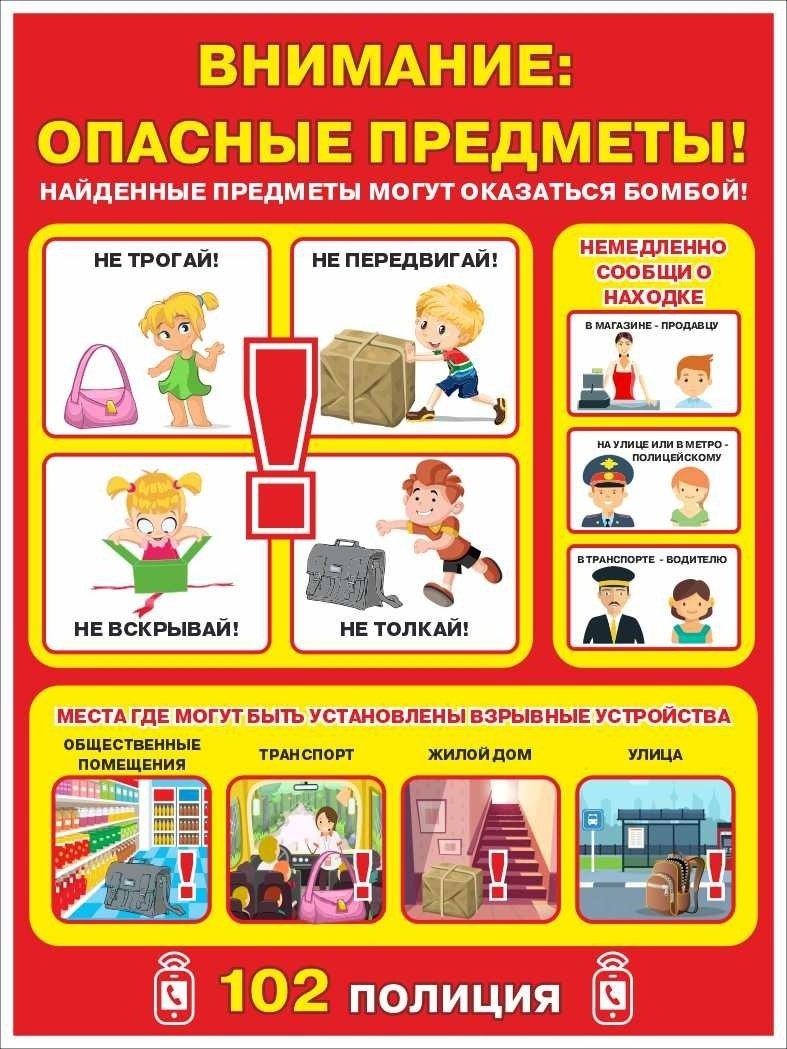 1. Будьте бдительны. Обращайте внимание на подозрительные предметы (бесхозные сумки, пакеты, коробки) и людей, ведущих себя нервно или странно. Не прикасайтесь к таким предметам и немедленно сообщите о находке в правоохранительные органы по телефонам 102 или 112.