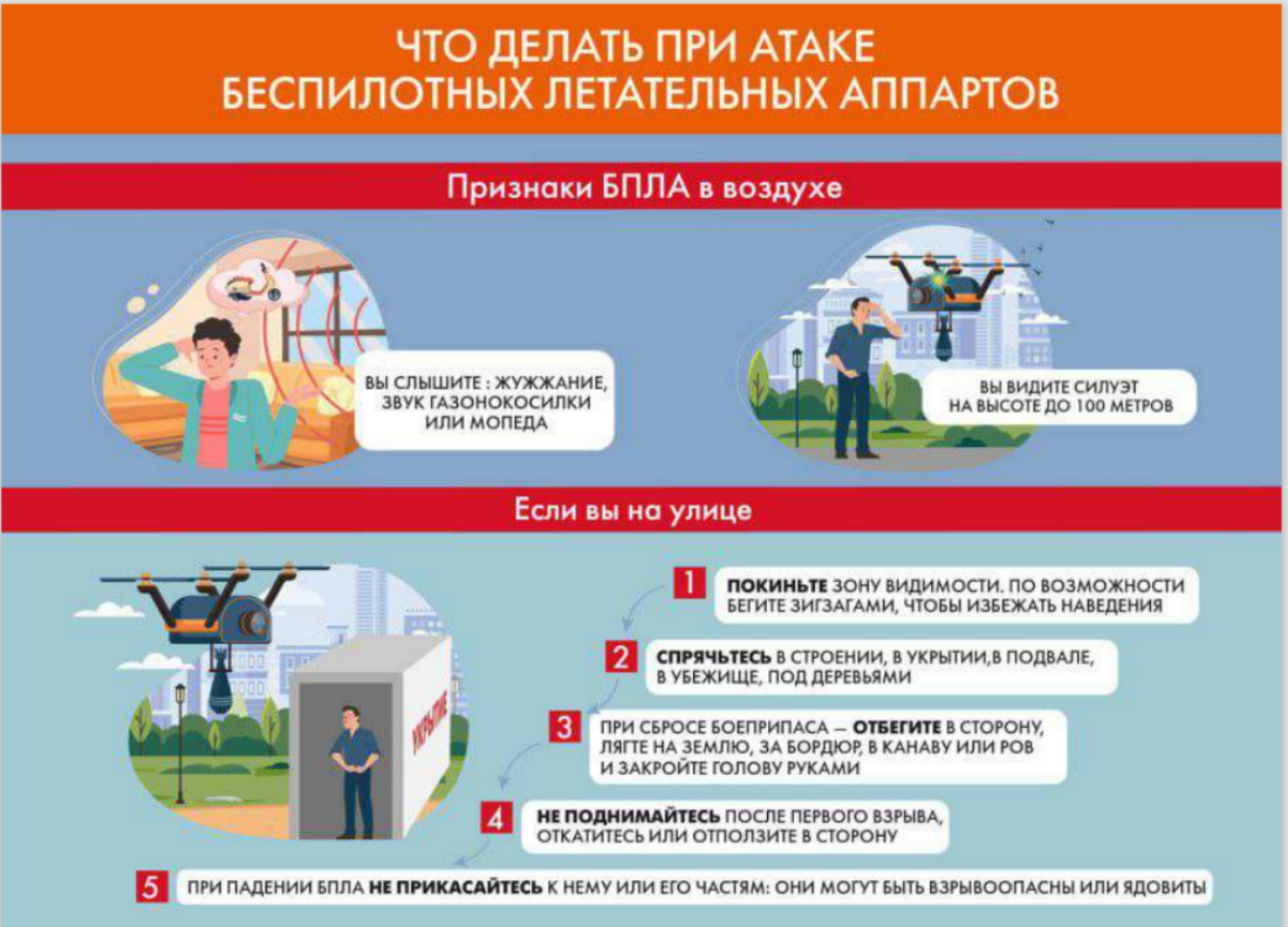 3. При взрыве или стрельбе немедленно падайте на землю, лучше под прикрытие (бордюр, машину и т. п.). Накройте голову руками для большей безопасности.