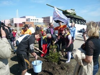 После митинга ветераны, студенты и школьники дружно высадили елочки. Стоит сказать, саженцы хвойных деревьев для посадки аллеи предоставила Дирекция защитных лесонасаждений Куйбышевской дороги.