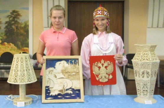 Анастасия Софьина заняла первое место в номинации "Национальные ремёсла". Признание жюри получили её сложные, ажурные и красивые работы. Очень непросто сделать своими руками красивый и полезный предмет из обычной фанеры. На конкурс Анастасия привезла только несколько своих работ: светильник, вазу, картину, герб России. Многие посетители выставки просили продать эти произведения искусства. Не зря жюри так высоко оценило умение выпиливать лобзиком студентки первого курса ТОИ Анастасии Софьиной.