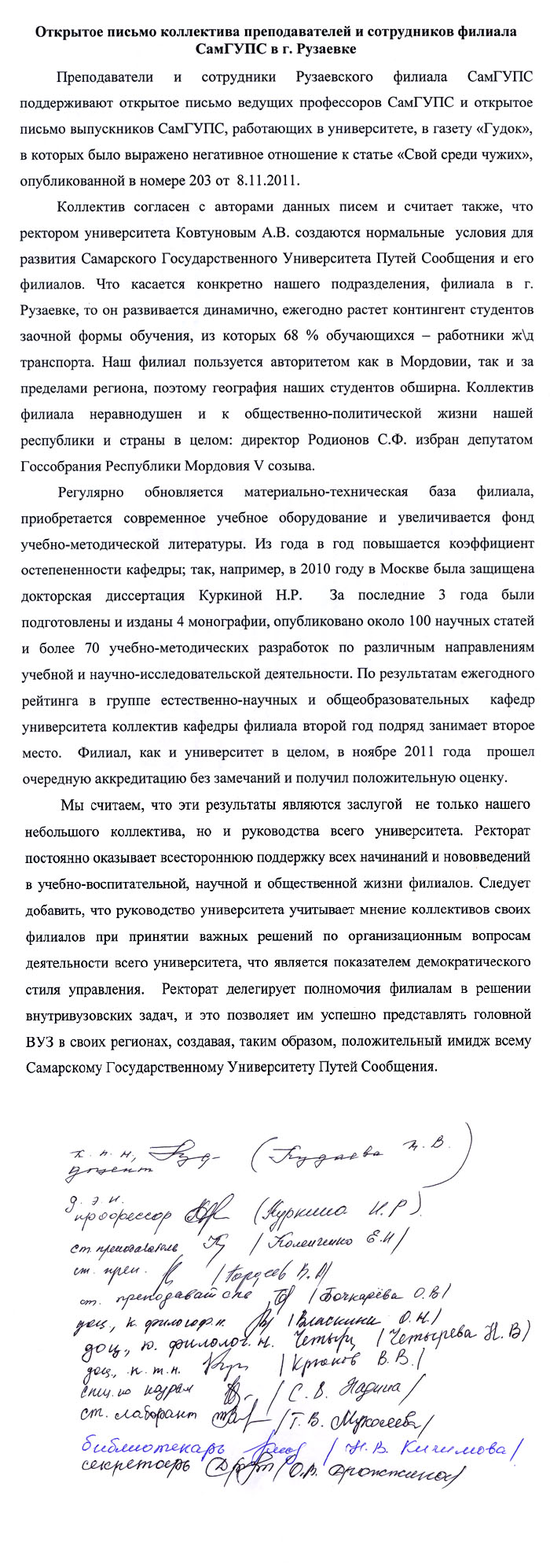 Открытое письмо коллектива преподавателей и сотрудников филиала СамГУПС в г. Рузаевке