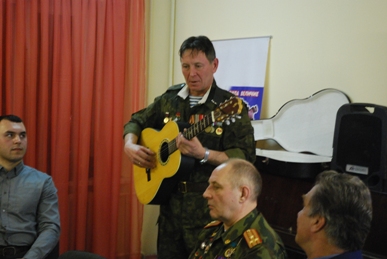 Константин Зарубин рассказал о том, что не расставался с гитарой даже в тяжелых условиях Афгана. Он исполнил свои музыкальные баллады под дружные аплодисменты студенческой аудитории.